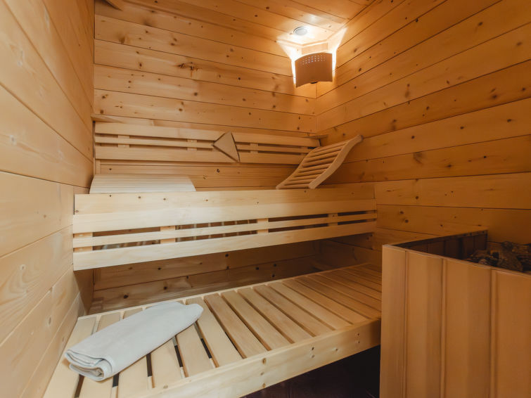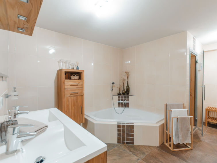4-room semi-detached house 140 m2, south facing position. Bright, comfortable and tasteful furnishings: entrance hall. Living/dining room with open-hearth fireplace and satellite TV (flat screen). Exit to the balcony. Open kitchen (oven, dishwasher, 4 ceramic glass hob hotplates, microwave, freezer, electric coffee machine, Capsules for coffee machine (Nespresso) extra). Sep. WC. On the lower ground floor: 1 double bedroom. 1 double bedroom. Exit to the garden, to the terrace. Bath/shower, sep. WC, double hand-basin, Sauna. Top floor: open large gallery with sloping ceilings with 2 beds (100 cm, length 200 cm). Large balcony, terrace. Terrace furniture. Beautiful view of the countryside and the forest. Facilities: Internet (WiFi, free). Please note: non-smoking house. Smoke alarm. Instead of an enclosed bedroom, some sleeping areas are located in an open-plan area (gallery, alcove, etc.). 50607-990160-2020
