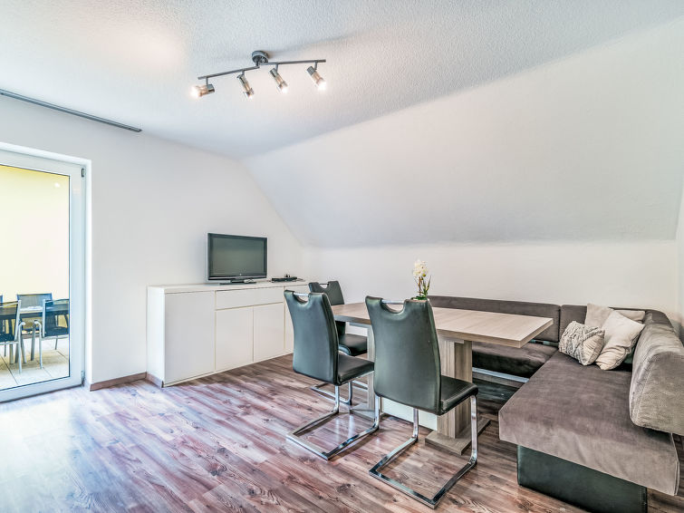4-room apartment 107 m2 on 1st floor. Fully renovated in 2017: living/dining room with satellite TV (flat screen), radio. Exit to the terrace. 2 double bedrooms, each room with hand-basin. Exit to the balcony. 1 room with 3 beds. Open kitchen (4 hot plates, oven, dishwasher, microwave). Bath/WC, sep. WC. Balcony, large terrace 30 m2. Terrace furniture. Facilities: Internet (WiFi, free). Please note: maximum 1 pet/ dog allowed. Smoke alarm. The apartment has a separate entrance. Partially sloping ceilings.
