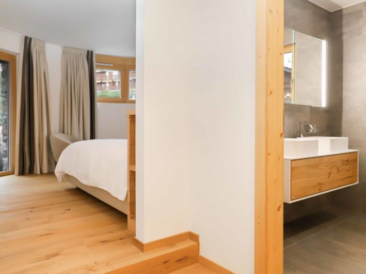 "Hédonia A7", 4-room apartment 150 m2 on 1st floor, south facing position. Spacious, modern and tasteful furnishings: living/dining room with open-hearth fireplace, dining table and TV (flat screen). Exit to the balcony, south facing position and west facing position. 1 room with 1 french bed (1 x 180 cm), shower/WC and double hand-basin. Exit to the balcony, west facing position. 1 room with 1 french bed (1 x 160 cm), shower/WC. Exit to the balcony, west facing position. 1 room with 2 beds (90 cm), bath/WC. Exit to the balcony, west facing position. Large, open kitchen (oven, dishwasher, 4 induction hot plates, freezer). Sep. WC. Balcony 52 m2, south facing position and west facing position. Very beautiful view of the mountains. Facilities: washing machine, dryer. Internet (WiFi, free). Garage space n 12. Please note: non-smokers only.