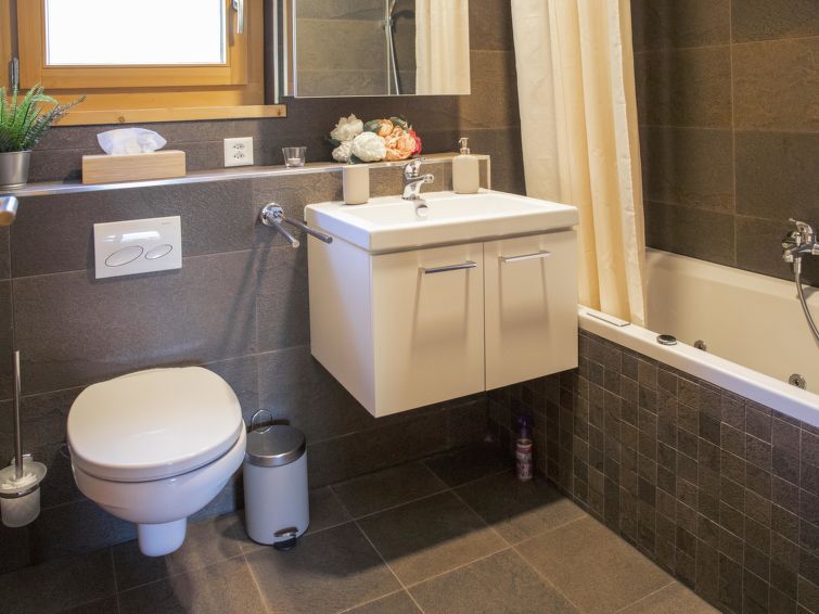 "Chalet Sans Soucis", 4-room apartment 74 m2 on 2 levels on 1st floor, south facing position. Renovated in 2020, comfortable and tasteful furnishings: 1 room with 1 french bed (1 x 160 cm). Exit to the balcony, south facing position. 1 room with 2 beds (90 cm). Bath/WC, hydro massage bath. Upper floor: small living/dining room with dining table. Exit to the balcony, south facing position. 1 room, without wardrobe with 1 double bed (2 x 90 cm), shower/WC. Open kitchen (oven, dishwasher, 4 ceramic glass hob hotplates, freezer, electric coffee machine, Capsules for coffee machine (Nespresso) extra). 2 small balconies 10 m2, south facing position. Balcony furniture, barbecue. Partial view of the mountains. Facilities: washing machine, dryer. Internet (WiFi, free). Parking space n 10 et 11 (fenced 2 cars). Please note: non-smokers only. No lift.