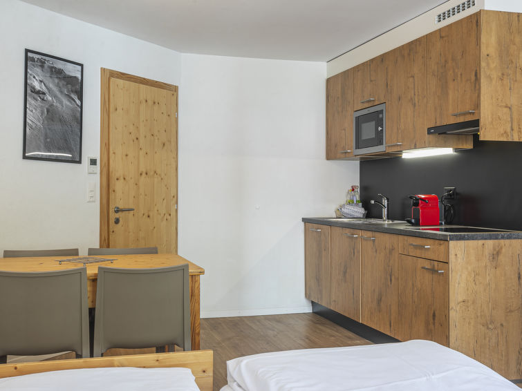 "T-Resort La Tzoumaz 2p4", 2-room apartment 33 to 40 m2. Bright, comfortable and modern furnishings: living/dining room with 1 pull-out bed (2 x 80 cm, length 200 cm), digital TV, international TV channels and flat screen. 1 room with 1 double bed (2 x 80 cm, length 200 cm). Open kitchen (dishwasher, 4 induction hot plates, microwave, electric coffee machine, Capsules for coffee machine (Nespresso) extra) with dining table. Bath/WC, sep. WC. Heating. Balcony or terrace. View of the ski run and the countryside. Facilities: children's high chair, baby cot (extra). Internet (WiFi, free). Please note: suitable for families. Non-smoking house. Maximum 1 pet/ dog allowed.
