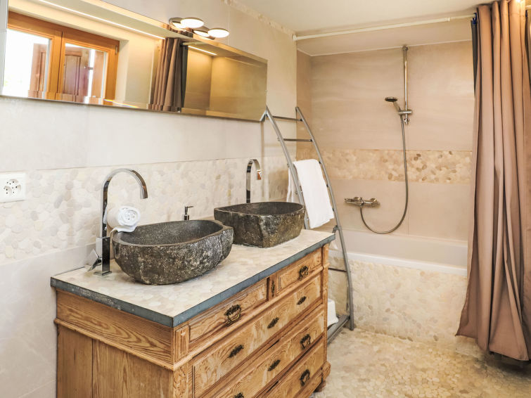 "La Bergerie", 5-room chalet 120 m2 on 2 levels. Partly renovated in 2018, very beautiful and tasteful furnishings: living/dining room with Scandinavian wood stove and cable TV. Exit to the terrace. Office. 1 room with 2 beds (80 cm, length 200 cm), shower/WC. Open kitchen (oven, dishwasher, 4 ceramic glass hob hotplates, toaster, kettle, microwave, electric coffee machine, Capsules for coffee machine (Nespresso) extra, raclette grill, fondue Set (cheese)). Sep. WC. Electric heating. On the lower ground floor: 1 room with 1 double bed (2 x 90 cm, length 190 cm). 1 small room with 2 beds (80 cm, length 190 cm). Bath/WC, double hand-basin. Electric heating. Top floor: open gallery. Wooden floors, natural stone floors. Comfortable furnishings in the country house style. Balcony, east facing position, large terrace, west facing position and north facing position. Terrace furniture, barbecue, deck chairs (2). Very beautiful view of the mountains, the valley and the countryside. Facilities: washing machine, children's high chair, baby cot, hair dryer. Internet (WiFi, free). Parking (2 cars). Please note: non-smoking house. Maximum 1 pet/ dog allowed.