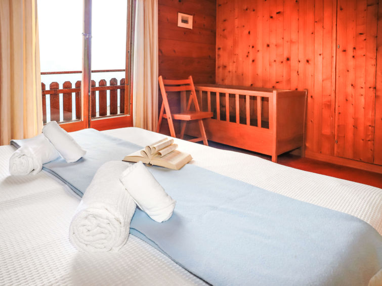 "Mungg", 4-room chalet 84 m2 on 2 levels. Simple and rustic furnishings: living/dining room with open-hearth fireplace, separate WC and satellite TV. Kitchen (oven, dishwasher, 4 ceramic glass hob hotplates, toaster, kettle, electric coffee machine, fondue Set (cheese)). Upper floor: 2 rooms, each room with 2 beds (90 cm, length 190 cm). 1 room with 1 x 2 bunk beds (90 cm, length 200 cm). Bath/WC. Electric heating. Balcony, north facing position, terrace 20 m2, north facing position and west facing position, lawn 45 m2. Terrace furniture, barbecue, deck chairs (2). View of the valley. Facilities: washing machine, dryer, children's high chair, baby cot. Internet (WiFi, free). Parking (2 cars) at 200 m. Please note: non-smokers only. Maximum 1 pet/ dog allowed. TV only DE.