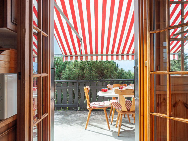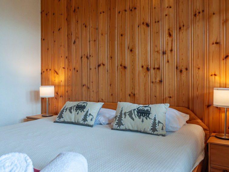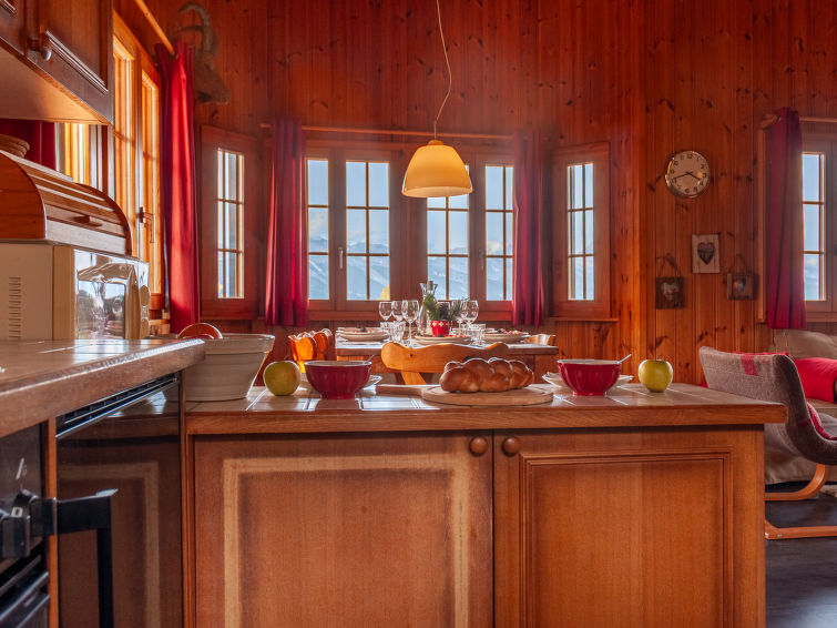 "Bivak", 4-room chalet 100 m2 on 2 levels. Practical furnishings: living/dining room with open-hearth fireplace, separate WC, cable TV and DVD. Exit to the terrace. Open kitchen (4 hot plates, oven, dishwasher, toaster, kettle, electric coffee machine, Capsules for coffee machine (Nespresso) extra, fondue Set (cheese)). Electric heating. On the lower ground floor: 2 double bedrooms, each room with 1 french bed (160 cm, length 200 cm). Exit to the garden, north facing position. Bath/WC. Upper floor: 1 room with sloping ceilings with 2 beds (90 cm, length 200 cm). Terrace, south facing position, garden 600 m2. Terrace furniture. Very beautiful panoramic view. Facilities: washing machine, children's high chair, baby cot, hair dryer. Internet (WiFi, free). Parking (roofed). Please note: non-smoking house.