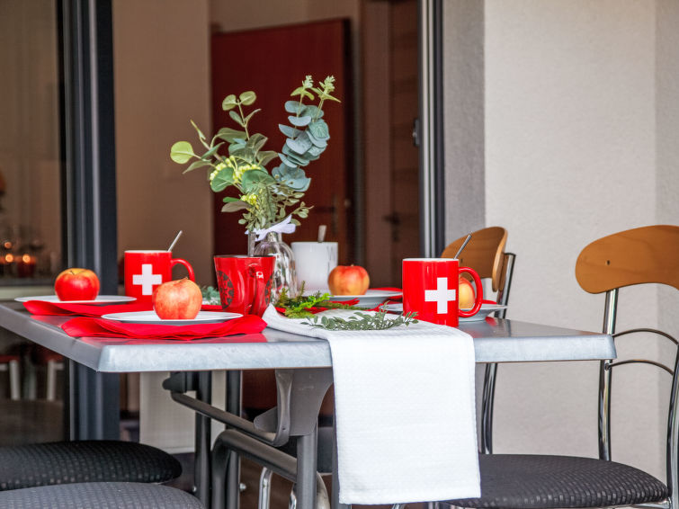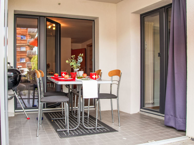 "Les Genets 124D", 2-room apartment 45 m2, on the upper ground floor, west facing position. Object suitable for 2 adults + 2 children. Partly renovated, practical and comfortable furnishings: entrance hall. Living/dining room with cable TV. Exit to the terrace. 1 room with 1 x 2 bunk beds (90 cm, length 190 cm), 1 french bed (2 x 90 cm, length 190 cm). Open kitchen (oven, dishwasher, 4 ceramic glass hob hotplates, toaster, kettle, electric coffee machine, Capsules for coffee machine (Nespresso) extra, raclette grill, fondue Set (cheese)). Shower/WC. Terrace, west facing position. Terrace furniture, barbecue. Partial view of the mountains. Facilities: Internet (WiFi, free). Garage (1 car). Please note: non-smokers only.