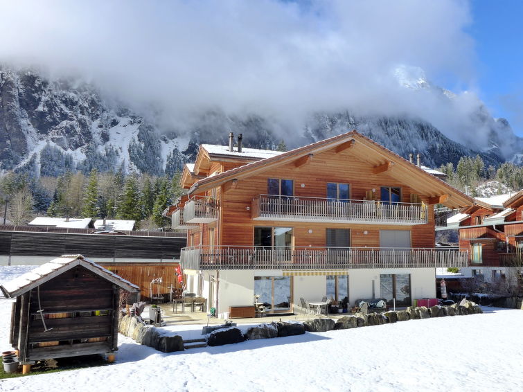 Beautiful apartment house, 3 storeys, built in 2018. In a sunny position in the residential district, 20 m from the river. In the house: storage room for skis, central heating system, washing machine, tumble dryer (for shared use). Parking at the house. Shop, restaurant 500 m, bus stop "Hüttetürli" 200 m, railway station "Kandersteg" 400 m, outdoor swimming pool 800 m. Tennis 800 m, walking paths from the house 50 m, gondola lift 1.4 km, skisport facilities 1.4 km, cross country ski track 600 m, ice rink 400 m, children's playground 1 km. Nearby attractions: Oeschinensee, Blausee. Well-known ski regions can easily be reached: Adelboden - Lenk, Nordic Arena Kandersteg. Hiking paths: Sunnbüel - Gemmi, Gasterntal. Please note: the owner lives in the same residence. Railway line closeby.
