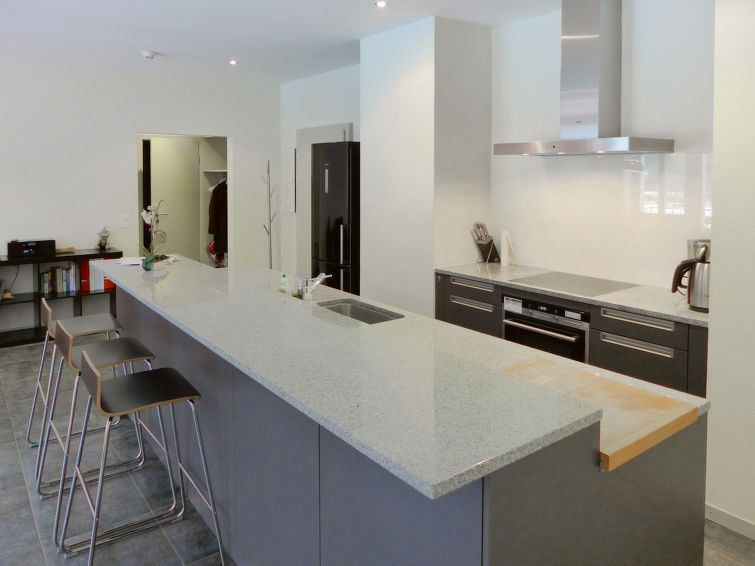 "Modern", 3-room apartment 90 m2 on 2nd floor. Spacious and bright, comfortable and modern furnishings: open living/dining room 43 m2 with cable TV, digital TV, flat screen, radio and CD-player. Exit to the balcony. 1 room 17 m2 with 1 french bed (160 cm, length 200 cm), shower/WC and double hand-basin. Exit to the balcony. 1 room 15 m2 with 2 beds (90 cm, length 200 cm), TV (flat screen). Open kitchen (oven, dishwasher, 4 ceramic glass hob hotplates, freezer, electric coffee machine, cooking island, combination microwave, fondue Set (cheese)) with bar. Shower/WC. Underfloor heating. 2 small balconies. Balcony furniture. Very beautiful view of the mountains, the countryside and the resort. Facilities: washing machine, dryer, baby cot for up to 3 year olds, hair dryer. Internet (WiFi, free). Parking (1 car). Please note: non-smokers only.