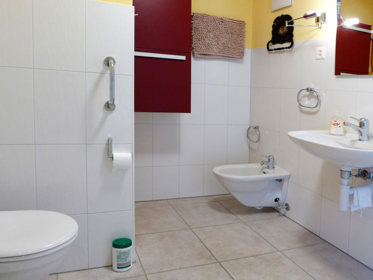 "Carina 4 4", 3-room apartment 110 m2 on 1st floor. Spacious and bright, very comfortable and tasteful furnishings: open large living/dining room with panoramic window with dining table, cable TV and hi-fi system. Exit to the balcony. 1 room with 1 double bed and 1 sleeping facility. 1 large room with panoramic window with 1 double bed. Exit to the terrace. Large, open kitchen (oven, dishwasher, 4 ceramic glass hob hotplates, toaster, kettle, microwave, electric coffee machine, raclette grill, fondue Set (cheese)). Shower/bidet/WC. Underfloor heating. Balcony, south facing position, large terrace, west facing position and north facing position. Terrace furniture, barbecue (portable), deck chairs. Marvellous view of the countryside and the resort. Facilities: hair dryer. Internet (WiFi, free). Garage (1 car) at the house. Please note: non-smokers only. Maximum 1 pet/ dog allowed.