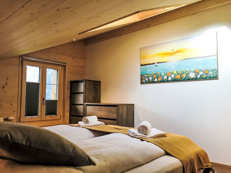 Beautiful, rustic 2-family house "Chalet Engelshüs". In the district of Wärgistal, 50 m from the skiing area, located by a road. In the house: storage room for skis, central heating system. In Winter: please take snow chains. Parking at the house. Grocery 700 m, shopping centre 2 km, restaurant 1.5 km, bar 1.5 km, bicycle rental 2 km, bus stop "Engelshaus" 10 m, railway station "Grindelwald Dorf" 2 km, outdoor swimming pool 1.2 km, indoor swimming pool 2 km. Golf course (9 hole) 2 km, tennis 2.5 km, minigolf 2.5 km, sports centre 2 km, mountain railway 1.5 km, gondola lift 2 km, slopes 50 m, ski rental 2 km, ski bus stop 10 m, cross country ski track 900 m, children's playground 2 km. Well-known lakes can easily be reached: Thuner-/Brienzersee 18 km. Please note: ski bus (free of charge). In case of good snow conditions, the house is accessible on skis. The keys‘ handover takes place by the agency Interhome in Grindelwald.