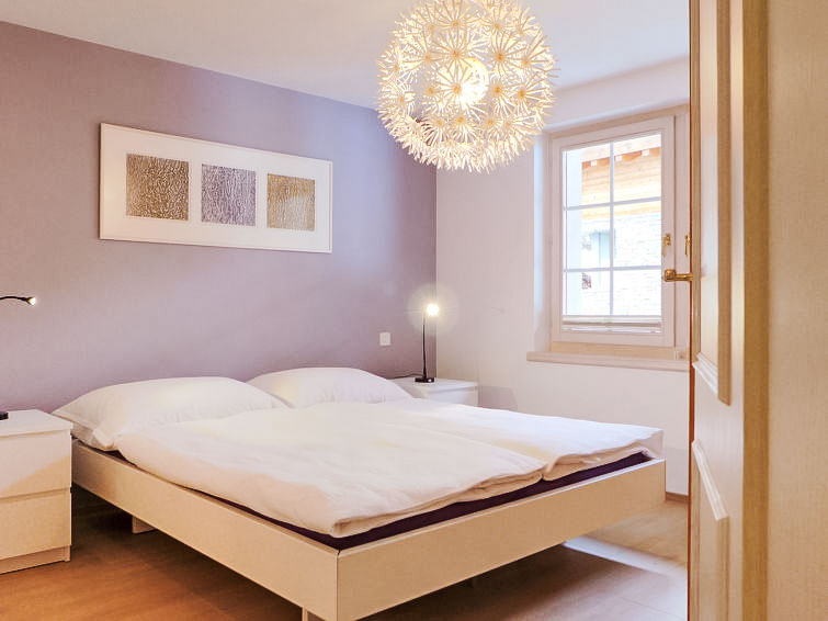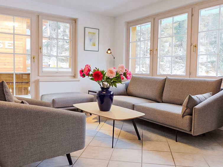 3-room apartment 88 m2 on 3rd floor, south facing position. Very comfortable and stylish furnishings: living/dining room with dining table and cable TV. Exit to the balcony. 1 double bedroom with 1 double bed and bath/WC. 1 double bedroom with 2 beds. Open kitchen (4 hot plates, oven, dishwasher, toaster, kettle, microwave, freezer, electric coffee machine, raclette grill, fondue Set (cheese)). Shower/WC. Balcony, south facing position. Balcony furniture. Very beautiful panoramic view of the mountains. Facilities: hair dryer. Internet (WiFi, free). Please note: non-smokers only.