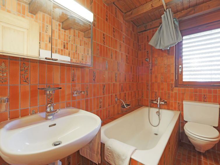 2-room apartment 65 m2, on the top floor. Partly with sloping ceilings, simple and cosy furnishings: living/sleeping room with 2 sofabeds (80 cm, length 200 cm), open-hearth fireplace (only for decoration), dining table and TV. Exit to the balcony. 1 room with 2 beds (90 cm, length 210 cm). Open kitchen (4 hot plates, oven, dishwasher, toaster, kettle, microwave, freezer, electric coffee machine, raclette grill, fondue Set (cheese)). Bath/WC. Balcony. Balcony furniture. Beautiful view of the mountains and Matterhorn. Facilities: hair dryer. Internet (WiFi, free). Please note: non-smokers only.