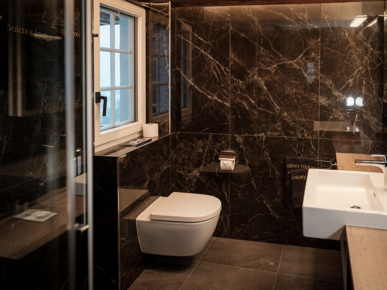 "Galaxy Lodge", 3-room apartment 52 m2 on 2 levels on 1st floor, east facing position. Fully renovated in 2023, beautiful and modern furnishings: living room with 1 double sofabed (160 cm, length 200 cm), TV. Exit to the balcony. 1 room with 1 double bed (1 x 180 cm, length 200 cm). Kitchen (oven, dishwasher, 4 ceramic glass hob hotplates, toaster, kettle, freezer, electric coffee machine). Shower/WC. Heating. Upper floor: 1 room with 1 double bed (1 x 180 cm, length 200 cm). Small balcony, west facing position. Partial view of the mountains. Facilities: hair dryer. Internet (WiFi, free). Please note: non-smokers only.