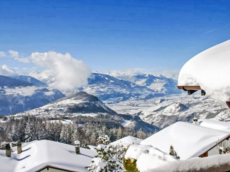 "Chalet Praline", 4-room chalet 100 m2 on 2 levels. Simple furnishings: living/dining room with open-hearth fireplace, cable TV and flat screen. Exit to the terrace, south facing position. Small kitchen (4 hot plates, oven, dishwasher, toaster, kettle, microwave, electric coffee machine, Capsules for coffee machine (Nespresso) extra, raclette grill, fondue Set (cheese)). Sep. WC. Electric heating. Upper floor: 1 room with sloping ceilings with 1 french bed (160 cm, length 200 cm). Exit to the balcony, south facing position. 1 room with sloping ceilings with 2 beds (2 x 90 cm, length 200 cm). Exit to the balcony, south facing position. 1 room with sloping ceilings with 1 french bed (140 cm, length 190 cm). Bath/bidet/WC. Parquet floors. Terrace, south facing position, lawn 130 m2. Terrace furniture, barbecue, deck chairs (2), box-room. Marvellous panoramic view of the mountains and the valley. Facilities: baby cot for up to 2 year olds, hair dryer. Internet (WiFi, free). Garage space n 7 at 100 m, height 200 cm, width 230 cm. Please note: non-smokers only. Maximum 1 pet/ dog allowed. Folding baby bed without sheets and blankets. Maximum: 1 parking space for 1 car depending on availability in the outdoor car park.