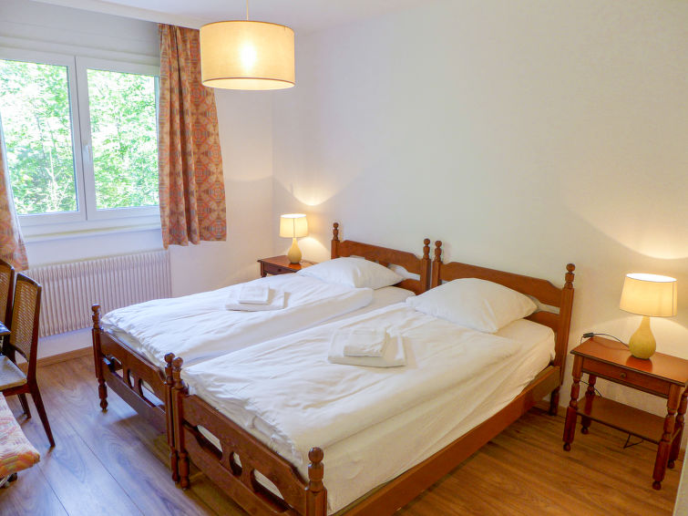 "Clairière des Barzettes B14", 4-room apartment 100 m2 on 4th floor. Living/dining room with cable TV and DVD. Exit to the balcony, south facing position. 1 room with 2 beds (90 cm, length 190 cm), cable TV (flat screen). 1 room with 2 beds (93 cm, length 197 cm). 1 room with 1 x 2 bunk beds (90 cm, length 190 cm). Kitchen (3 hot plates, oven, dishwasher, toaster, kettle, microwave, electric coffee machine, Capsules for coffee machine (Nespresso) extra, raclette grill, fondue Set (chinoise, cheese)). Exit to the balcony. Bath/bidet/WC, shower/WC. Balcony 15 m2, south facing position. Balcony furniture, deck chairs (1). Very beautiful view of the mountains. Facilities: iron, hair dryer. Internet (WiFi, free). Garage space n box 14, height 200 cm, width 234 cm. Please note: non-smokers only. Maximum 1 pet/ dog allowed.