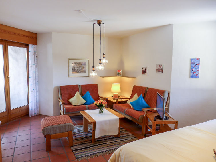 "Chesa Maurus A12", 1-room apartment 50 m2 on 3rd floor. Practical and cosy furnishings: living/sleeping room with 2 folding beds (90 cm, length 200 cm), open-hearth fireplace, dining table and TV (flat screen). Exit to the balcony. Interconnecting room with 1 folding bed (90 cm, length 200 cm). Open kitchen (4 hot plates, oven, dishwasher, toaster, kettle, electric coffee machine). Exit to the balcony. Bath/WC. Balcony 6 m2. Balcony furniture. Beautiful view of the mountains, the countryside and the resort. Facilities: hair dryer. Internet (WiFi, free). Garage space n 17 - A12 on the property (1 car), height 210 cm, width 220 cm. Please note: non-smokers only, non-smoking house. : the sleeping area for the third person can be separated by a sliding door.