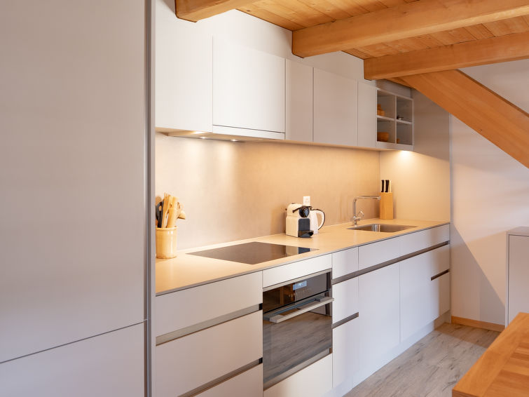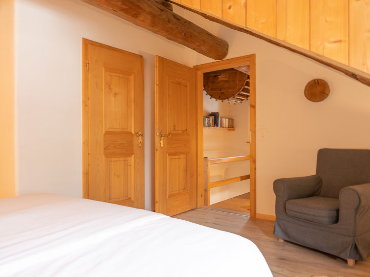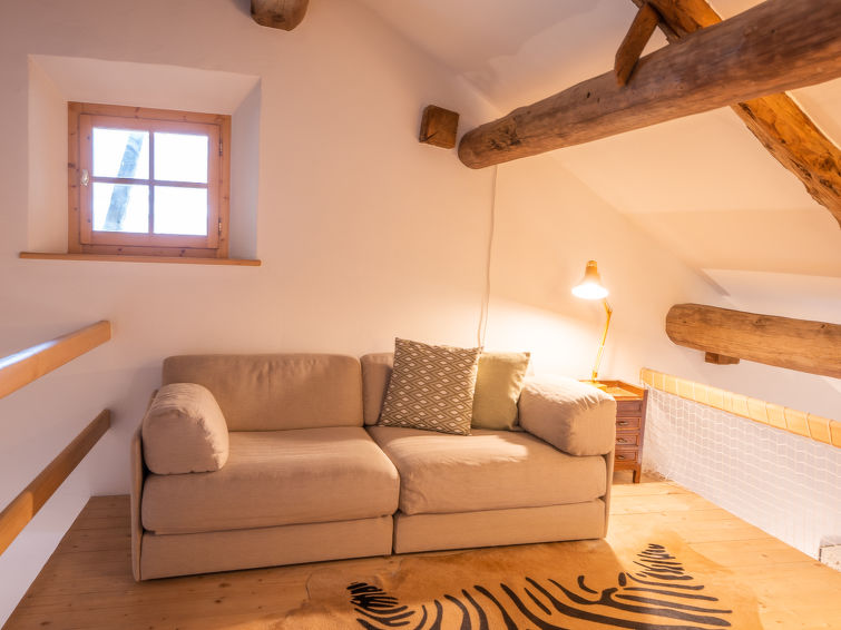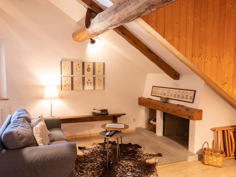 "Chesa Olgiati 1", 3-room apartment 75 m2 on 2 levels on 3rd floor. Partly with sloping ceilings, cosy and wooden furniture furnishings: living/dining room with open-hearth fireplace (only for decoration), TV and flat screen. 1 children's room with 2 beds (75 cm, length 185 cm). Open kitchen (oven, dishwasher, 4 induction hot plates, toaster, kettle, electric coffee machine, Capsules for coffee machine (Nespresso) extra, fondue Set (cheese)) with dining table. Bath/bidet/WC. Heating. Upper floor: (steep stair), 1 room with sloping ceilings with 1 double bed (2 x 80 cm, length 200 cm), shower/WC. Open gallery. Side view of the mountains. Facilities: iron, hair dryer. Internet (WiFi, free). Garage space n 19 Holland, height 177 cm, width 210 cm. Please note: not suitable for children under 6 years. Non-smokers only. No lift.