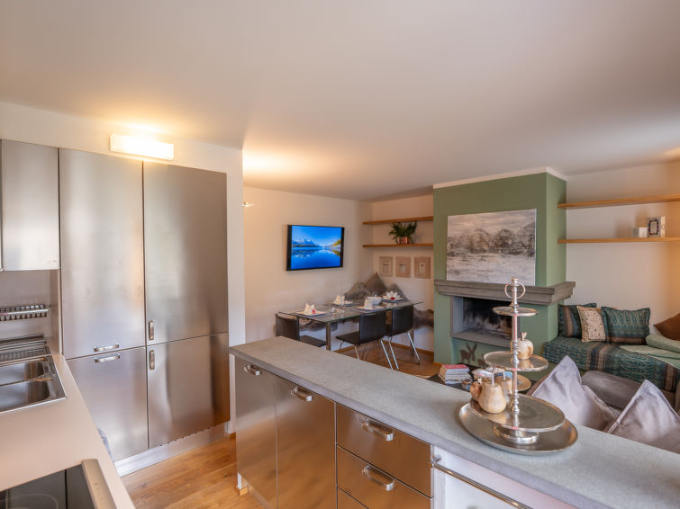 "Chesa Polaschin 4 - Silvaplana", 3-room apartment 74 m2, on the ground floor. Tasteful and cosy furnishings: living/dining room with open-hearth fireplace (only for decoration), TV (flat screen). Exit to the terrace. 1 double bedroom with 1 double bed (1 x 160 cm, length 200 cm), bidet and shower/WC. 1 room, without window with 2 beds (90 cm, length 190 cm), bidet and shower/WC. Open kitchen (oven, dishwasher, 4 ceramic glass hob hotplates, toaster, kettle, freezer, electric coffee machine, Capsules for coffee machine (Nespresso) extra, raclette grill, fondue Set (cheese)). Parquet floors. Terrace furniture. Beautiful view of the mountains and the resort. Facilities: iron, hair dryer. Internet (WiFi, free). Garage space n Nr. 33/34 at 200 m, height 200 cm, width 210 cm. Please note: non-smokers only, non-smoking house. Maximum 1 pet/ dog allowed.