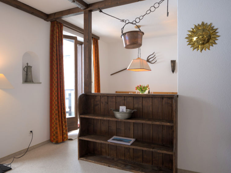 "Chesa Linaria", 3-room apartment 70 m2, on the upper ground floor. Simple furnishings: living room with dining nook and TV (flat screen). Exit to the balcony, south facing position. 1 room with 1 double bed (2 x 90 cm, length 185 cm). 1 small room with 2 beds (90 cm, length 190 cm). Kitchen (oven, dishwasher, toaster, kettle, electric coffee machine, Capsules for coffee machine (Nespresso) extra, raclette grill, fondue Set (chinoise)) with hatch. Bath/WC, shower/bidet/WC. Heating. Small balcony. Terrace furniture. Beautiful view of the mountains. Facilities: iron, hair dryer. Internet (WiFi, free). Garage space n 9 (small!), height 205 cm, width 190 cm. Maximum 1 pet/ dog allowed. 756.8668.2733.01