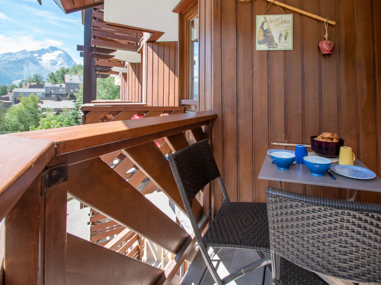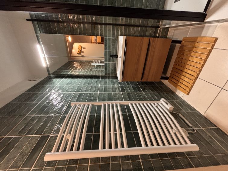 2-room apartment 30 m2 on 3rd floor. Living/dining room with satellite TV. 1 room with 1 french bed (140 cm, length 190 cm). Alcove with 1 x 2 bunk beds (90 cm, length 190 cm). Kitchenette (4 hot plates, dishwasher, microwave). Shower, sep. WC. Electric heating. Balcony, south facing position and, east facing position. Beautiful view of the mountains and the resort. Instead of an enclosed bedroom, some sleeping areas are located in an open-plan area (gallery, alcove, etc.). 38253000436SB