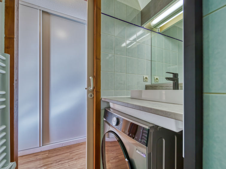 "Balcons d'Olympie 323 - B", 2-room apartment 29 m2 on 3rd floor. Comfortable furnishings: living/dining room with 1 pull-out bed (2 pers. 2 x 80 cm, length 190 cm), TV (flat screen). Exit to the balcony. 1 room with 1 pull-out bed (2 x 80 cm, length 190 cm). Kitchenette (oven, dishwasher, 3 ceramic glass hob hotplates, toaster, kettle, microwave, electric coffee machine, raclette grill). Shower, sep. WC. Electric heating. Large balcony, south facing position. Beautiful view of the mountains and the ski run. Facilities: washing machine. Internet (WiFi, extra). Please note: smoke alarm. Offer by a commercial proprietor according to Art. 155, IV, CGI