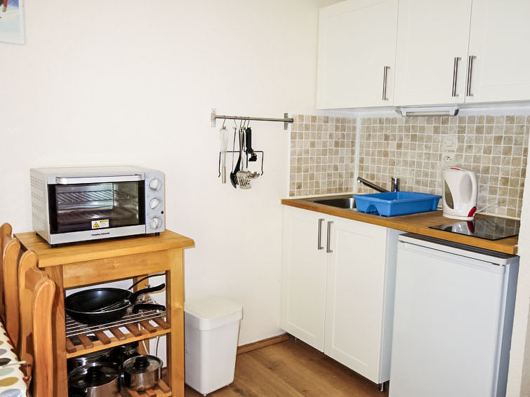 1-room studio 23 m2 on 2nd floor. Living/dining room with 1 double sofabed and TV. Exit to the balcony. Alcove with 1 x 2 bunk beds. Kitchenette (2 hot plates, oven, toaster, kettle, electric coffee machine). Bathroom, sep. WC. Electric heating. Small balcony 3 m2, south facing position. View of the mountains. Facilities: Internet (WiFi, extra). Please note: smoke alarm. Instead of an enclosed bedroom, some sleeping areas are located in an open-plan area (gallery, alcove, etc.). 74085000469WS